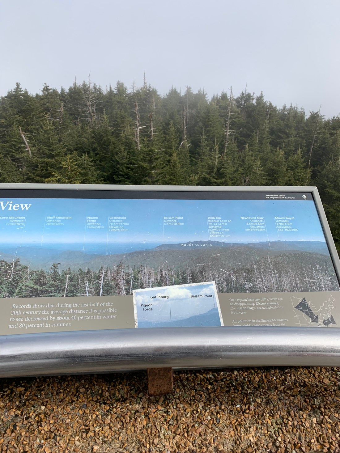 Mt Collins, mile 203. Started in rain as usual; stopped raining about noon. Got to Clingmans Dome, highest point on the Appalachian Trail at 6600 ft. On the observation tower, there was nothing to see but fog.