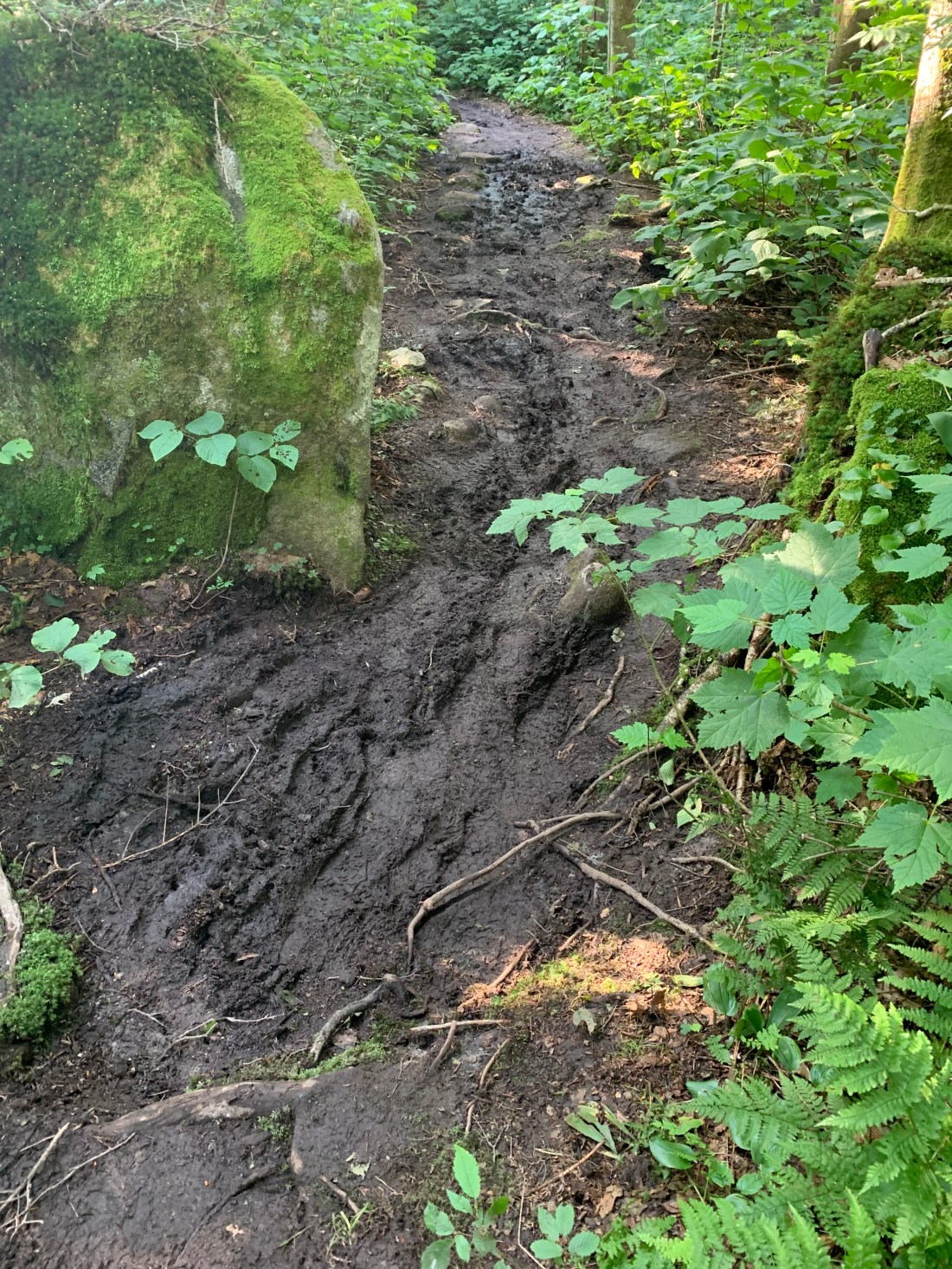 Day 130 7/26/2019. Trailside camp. Mile1635. Beautiful day hiking; so good I quit early to enjoy relaxing in the woods. Trail still muddy but improving. Here’s a photo of trail mud.